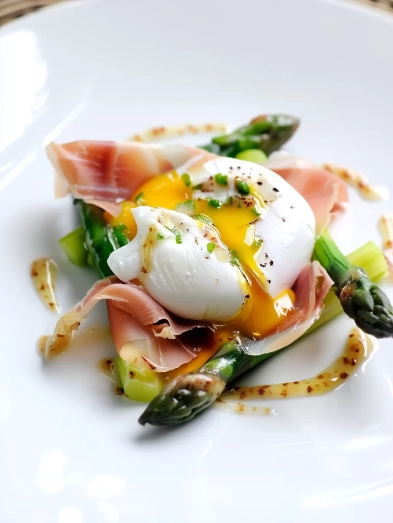 Poached Egg with English Asparagus, Prosciutto & Honey-Mustard Vinaigrette